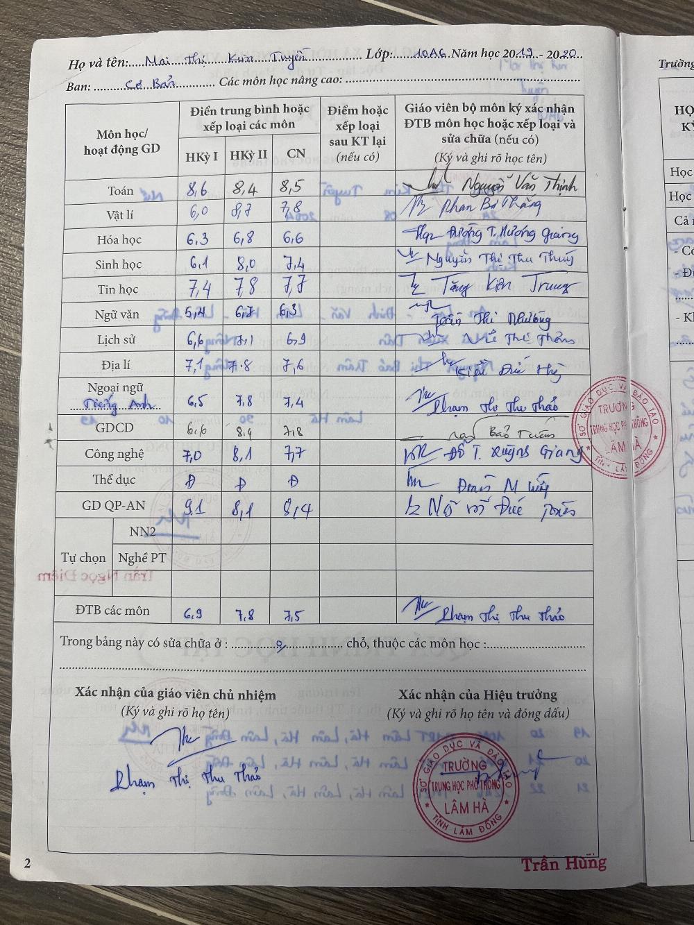 HKI lớp 10: 6.9 - HKII lớp 10: 7.8 - HKI lớp 11: 7.6 - HKII lớp 11: 7.5 - HKI lớp 12: 7.9
